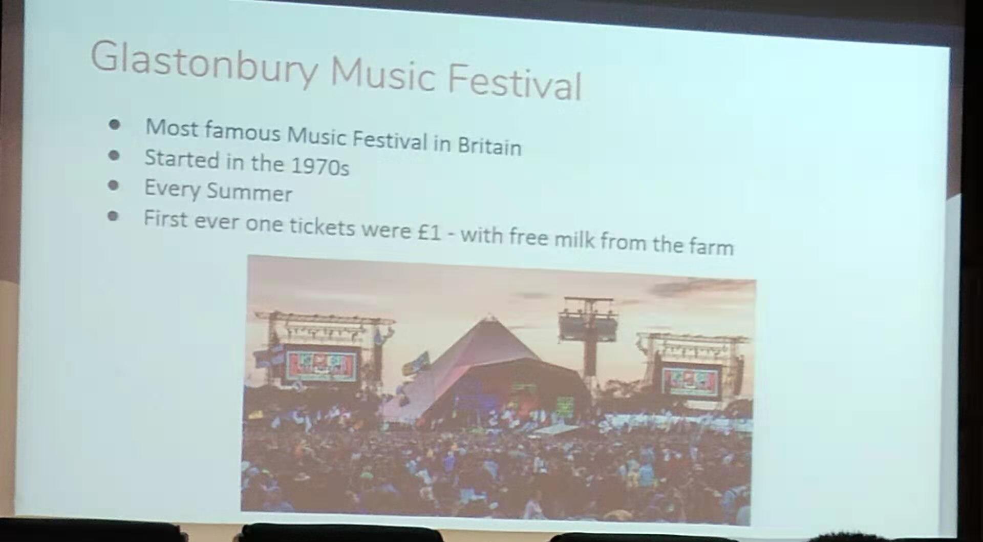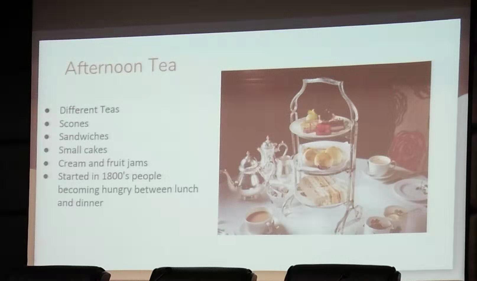 Oliver就英国传统文化进行了讲解,他向同学们介绍了Cheese Rolling,Pub Culture,Afternoon Tea,Queuing,Boxing Day,Clastonbury Music Festival等英国特有的文化现象,还介绍了许多英国的谚语。其中不乏不同文化之趣味,如“一个雪人通常对另一个雪人说什么?”答案是:你闻到胡萝卜的香气了么?再有英文谚语“speak of devil”,竟是“说曹操曹操到”之意。同学们听得津津有味,并积极与外教互动。