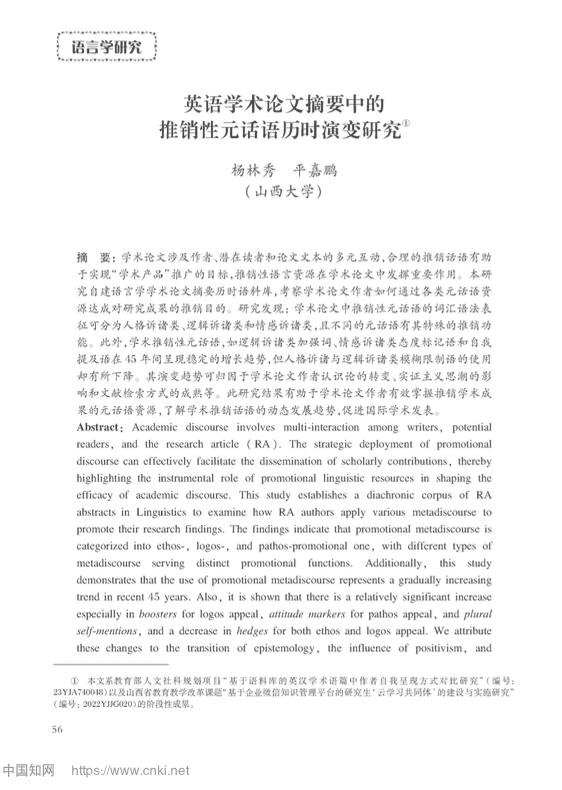 杨林秀教授与其博士研究生平嘉鹏在CSSCI集刊《复旦外国语言文学论丛》(2025年第3期)发表题为“英语学术论文摘要中的推销性元话语历时演变研究”的研究论文。该刊物由复旦大学外文公司主办,是中文社会科学引文索引(CSSCI)来源集刊;中国人文社科核心(AMI)A集刊,在业界影响广泛,在各种刊物评价体系中获得好评, 并获得相关领域专家学者的高度认可。