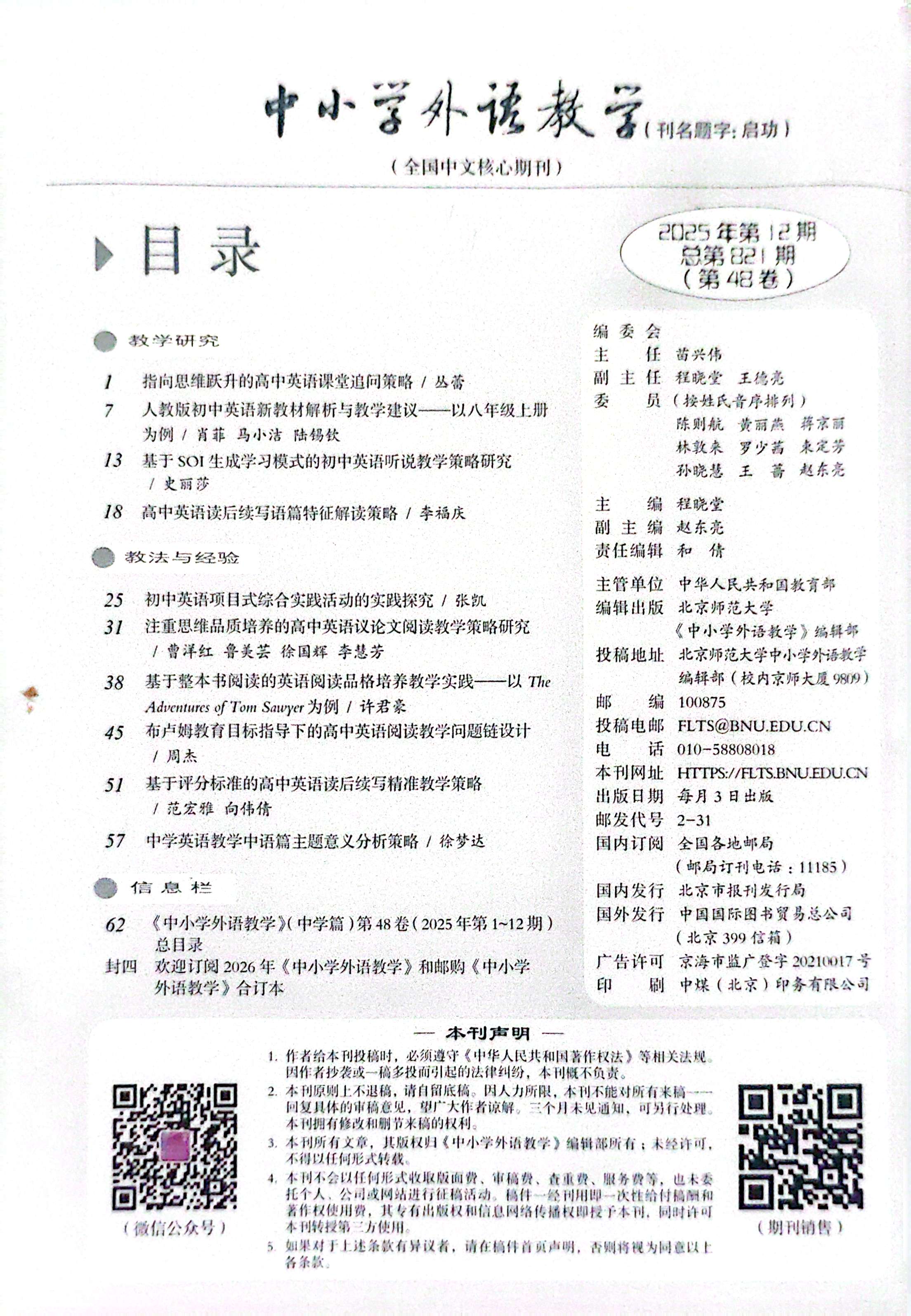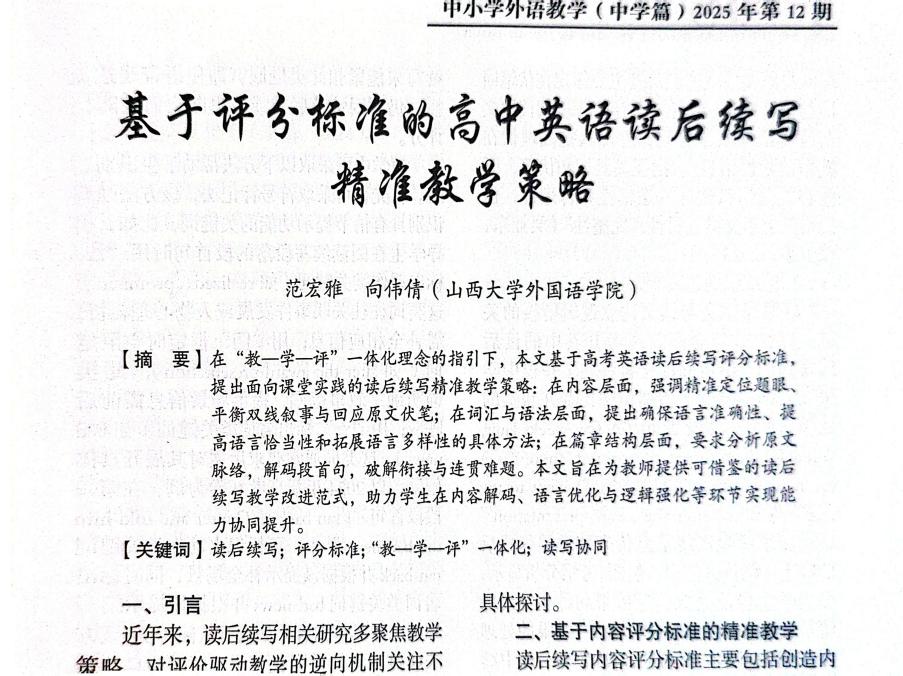 公司英语专业教师范宏雅在《中小学外语教学(中学篇)》2025年第12期发表学术论文《基于评分标准的高中英语读后续写精准教学策略》。该刊物由北京师范大学主办,为全国中文核心期刊、中国期刊方阵双效期刊、国家新闻出版总署与教育部联合推荐优秀期刊,是我国基础教育外语教学领域的权威学术刊物。