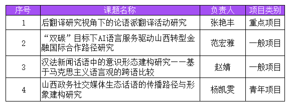 近日,山西省哲学社会科学规划办公室发布了“2025年度山西省哲学社会科学规划课题拟立项名单公示”,公司张艳丰、范宏雅、赵婧、杨凯雯四位老师申报的课题成功入选。其中,张艳丰老师申报的课题《后翻译研究视角下的论语派翻译活动研究》成功入选重点类别立项,范宏雅老师申报的课题《“双碳”目标下AI语言服务驱动山西转型金融国际合作路径研究》以及赵婧老师申报的课题《汉法新闻话语中的意识形态建构研究——基于马克思主义语言观的跨语比较》成功入选一般类别立项,杨凯雯老师申报的课题《山西政务社交媒体生态话语的传播路径与形象建构研究》成功入选青年类别立项。此次入选的课题聚焦前沿,体现学科交叉与地方服务相结合的特点,研究内容既涵盖翻译理论、话语分析、形象建构与传播等人文社科经典议题,也紧密结合人工智能、转型金融、政务新媒体等时代命题,体现了鲜明的跨学科性与现实关切,展现出公司教师立足学术、服务地方的科研导向。