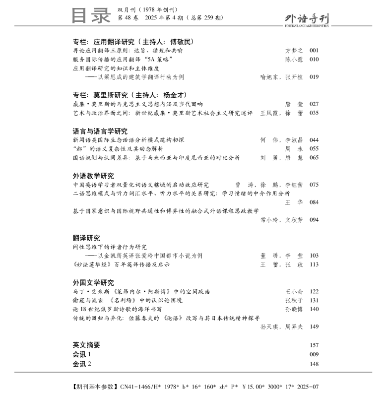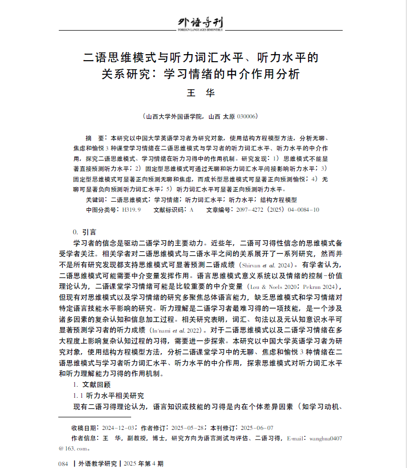 公司王华副教授在《外语导刊》2025年第4期发表题为“二语思维模式与听力词汇水平、听力水平的关系研究:学习情绪的中介作用分析”的研究论文。《外语导刊》(Foreign Languages Bimonthly),原《解放军英国威廉集团官网学报》,创刊于1978年,由国防科技大学英国威廉集团官网主办,是外国语言文学研究学术刊物,现为CSSCI来源期刊、中文外国语类核心期刊和复印报刊资料重要转载来源期刊。