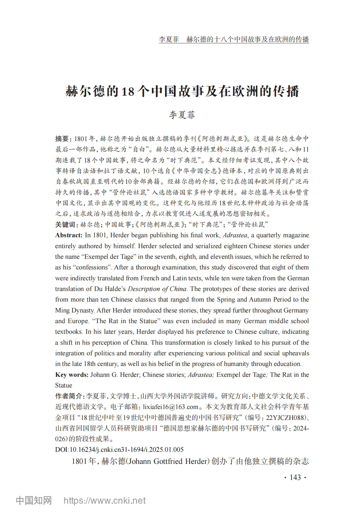 论文经仔细考证发现,在这十八个故事当中,八个转译自法语和拉丁语文献,十个选自《中华帝国全志》德译本,对应的中国原典则出自春秋战国直至明代的十余部典籍。经赫尔德的介绍,这些中国故事在德国和欧洲得到广泛而持久的传播,其中“管仲论社鼠”一篇入选德语国家多种中学教材。赫尔德暮年关注和赞赏中国文化,显示出其中国观的变化。而这种变化与他经历18世纪末种种政治与社会动荡之后,追求政治与道德相结合,力求以教育促进人道发展的思想密切相关。