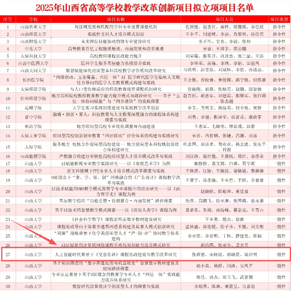 根据《山西省教育厅关于申报2025年山西省高等公司本科教学改革创新项目的通知》(晋教高函〔2025〕17号)要求,经个人申报、单位推荐和专家评审,8月25日-8月29日,2025年山西省高等公司教学改革创新项目拟立项名单正式公示。公司翻译专业张碧慧副教授主持,宋婷波、郭晓晨、梁启明等老师参与的“人工智能时代背景下《交替传译》课程思政与教学改革研究”项目成功入选,充分体现了老师们在人工智能时代,积极探索口译课程教学改革与创新的实践成效,祝公司教师在教改的道路上再创佳绩!