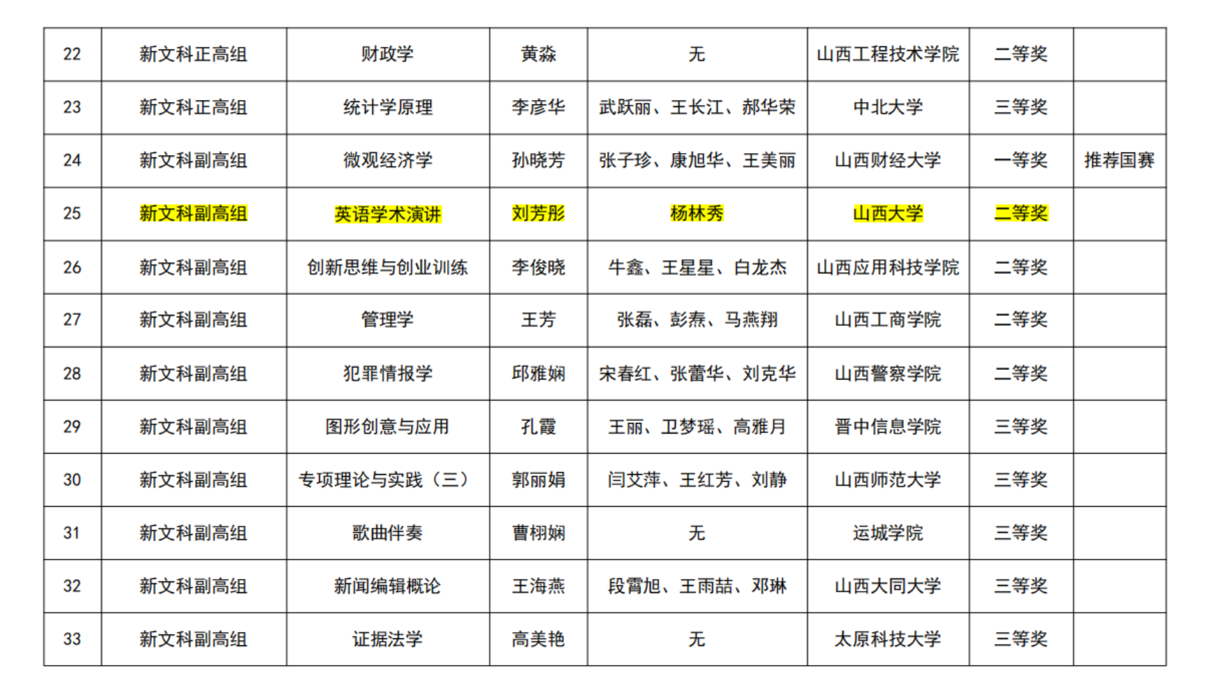 近日,由山西省教育厅指导、山西财经大学承办的第五届全国高校教师教学创新大赛山西赛区省赛圆满落幕。公司刘芳彤、杨林秀教师团队凭借《英语学术演讲》课程的创新实践,在新文科副高组竞赛中以第二名的优异成绩荣获二等奖,实现了公司在该项赛事中的省级奖项突破。
