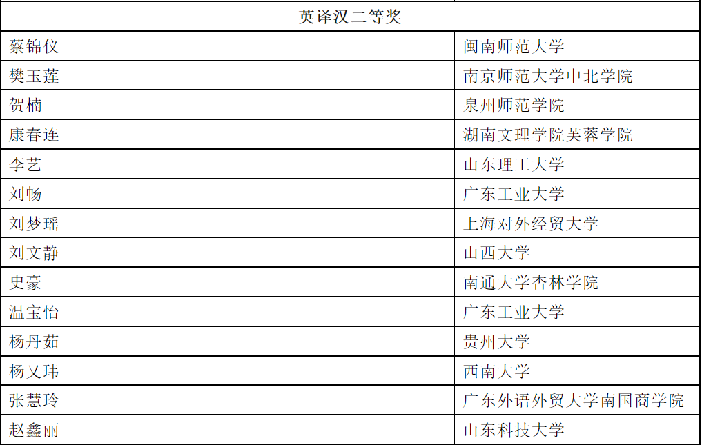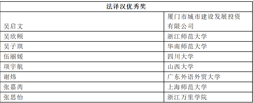 经过严格的评审和终审讨论,共评出获奖者1127名。一等奖23名;二等奖51名;三等奖79名;优秀奖974名。其中,公司2022级翻译专业硕士刘文静同学获英译汉二等奖,2022级翻译专业本科张芷琪同学获英译汉优秀奖,2021级法语专业本科项宇航同学获法译汉优秀奖。(全部获奖名单可登录https://mp.weixin.qq.com/s/711eHLKqGsiEpZa8fqUNbA)