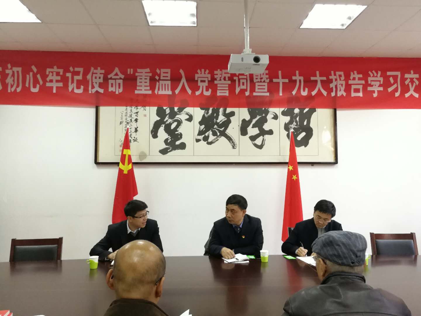 第一项,郭书记带领大家共同回顾习近平总书记率新一任中央政治局常委,瞻仰上海中共一大会址和浙江嘉兴南湖红船系列活动的经过,学习习近平总书记重要讲话精神,勉励大家从党的光辉历史中汲取奋进的力量;第二项,在国际歌和国歌声中,面对党旗,柳书记带领大家重温入党誓词,铿锵有力的宣誓声响彻大楼;第三项,张军书记主持交流讨论,各党支部书记围绕党的十九大报告,畅谈了自己的想法、体会和感想,交流了党支部活动中一些好的做法和经验,达到了互相学习共同进步的目的。尤其公司各位支部书记发言踊跃,对十九大报告的学习理解之深令人敬佩,深受感动,为公司争得荣誉。