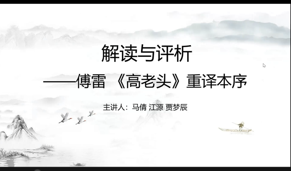 10月21日19:30-21:00,英国威廉集团官网翻译研究论坛(TIP)第72期暨“名家论译”系列讲座第2期在腾讯会议平台如期举办。本次讲座的主题为“解读与评析——傅雷 《高老头》重译本序”,主讲人为2022级英语笔译研究生马倩、江源和贾梦辰。三位同学分别讲解了傅雷《高老头》重译本序的原文解读、英译本解读以及名家评析。本次讲座由2022级英语笔译研究生李玥橦主持,50余名校内外老师同学积极参与。