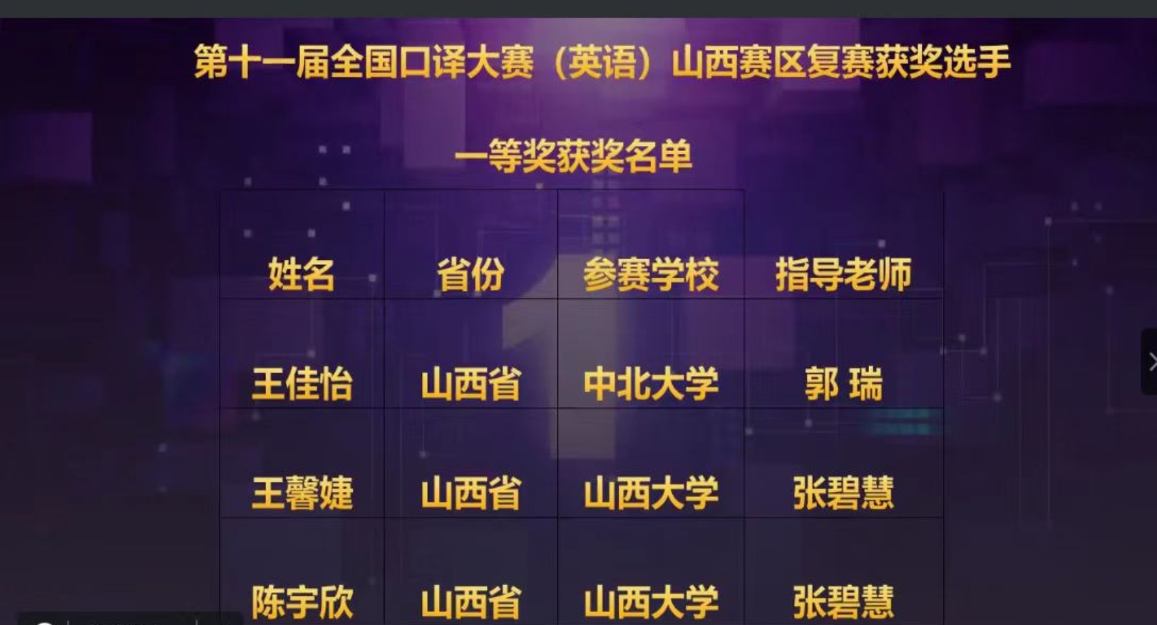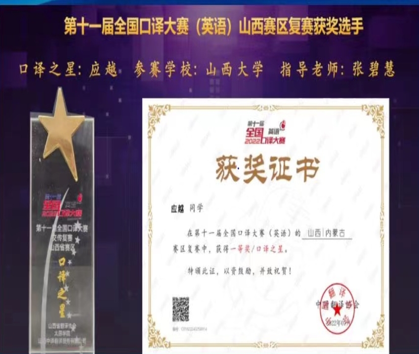 7月10日上午,第11届全国口译大赛山西/内蒙古赛区复赛结果揭晓,公司学子表现优异,取得了不俗的成绩。2018级翻译专业员工应越取得本赛区一等奖第一名,获得省级“口译之星”、2019级翻译专业员工王馨婕、陈宇欣获得一等奖、2018级翻译专业员工张龙飞、陆江芸以及2019级翻译专业员工要慧敏获得三等奖。张碧慧老师获得优秀指导教师奖。