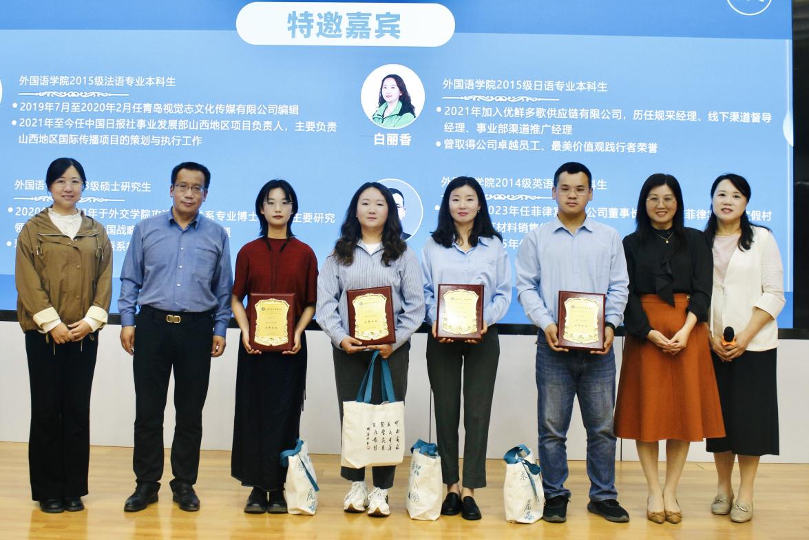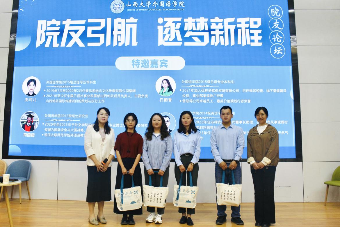 论坛尾声,公司领导为四位院友颁发文创产品及优秀院友奖牌,并合影留念。范宏雅老师在总结中表示,四位院友的亲身经历勾勒出从外院课堂到职场实践的成长轨迹,彰显了奋斗与蜕变的力量。她寄语外院学子以院友为镜,在深耕专业中孕育底气,在拥抱变化中积蓄勇气,让外院赋予的“全球视野、人文温度”成为穿越职场风雨的精神底色,绽放为属于同学们自己的职业荣光。