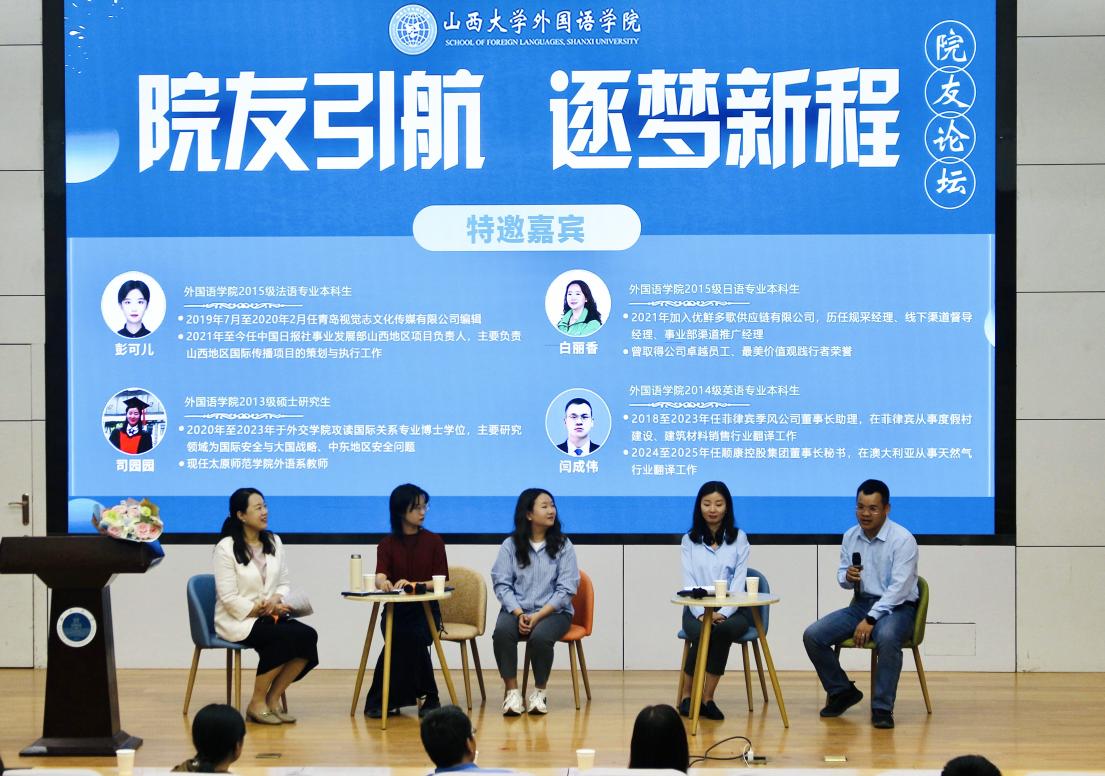 四位院友结合自身经历,强调了夯实专业基础与主动探索的重要性。就职于中国日报社事业发展部的彭可儿分享了大四求职受限的经历,她指出专业课的扎实程度直接影响求职选择,建议同学们通过员工活动、跨专业学习探索职业方向。就职于优鲜多歌供应链有限公司的白丽香以校园支教面试为例,鼓励大家“认真准备,必有所成”,通过跨领域实践积累综合能力、明确职业兴趣。任教于太原师范公司外语系的司园园讲述了从培训机构离职后跨考外交公司博士的转型历程,提醒同学们避免盲目从众求职,要兼顾长期成长价值,突破专业局限。从事海外翻译工作的闫成伟则提到外语专业男生在翻译领域的优势,强调需超越单一语言技能,提升综合竞争力。