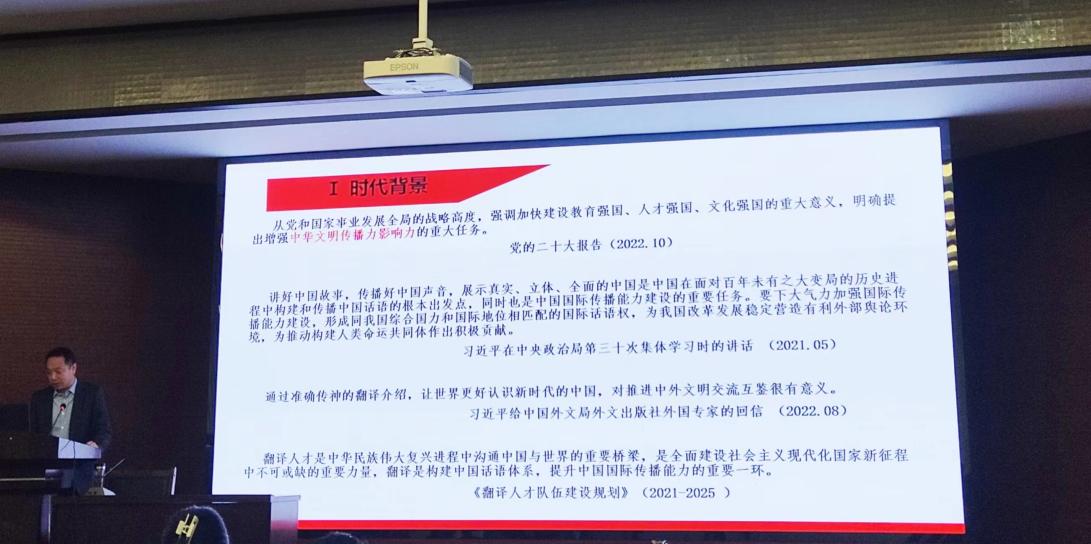 本次讲座主要分为三个部分。第一部分主要介绍了翻译的时代背景,主要包括2022年10月召开的中国共产党第二十次全国代表大会,从党和国家事业发展全局的战略高度,特别强调了教育强国、人才强国、文化强国的重大意义,明确提出增强中华文明传播影响力的重大任务,以及2022年8月,习近平总书记在给中国外文局外文出版社外国专家的回信中强调,通过准确传神的翻译介绍,让世界更好地认识新时代的中国,对推进中外文明交流互鉴很有意义。