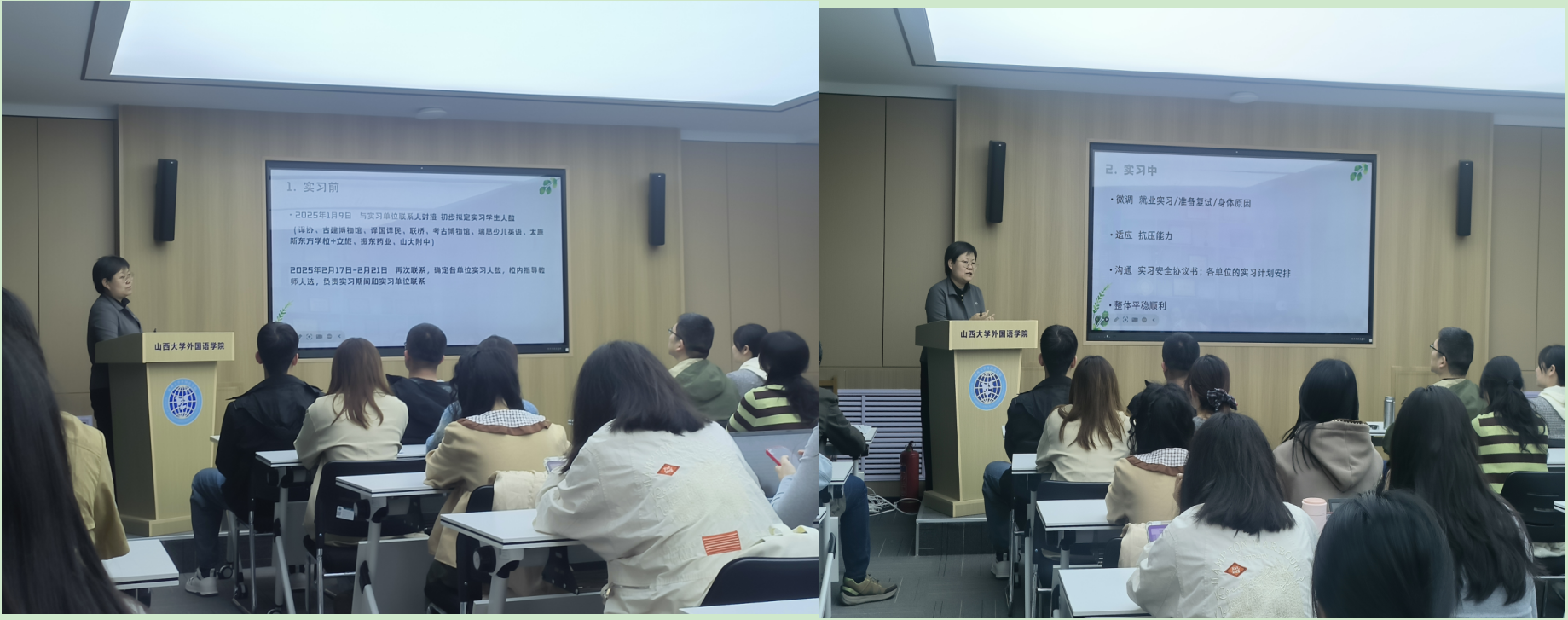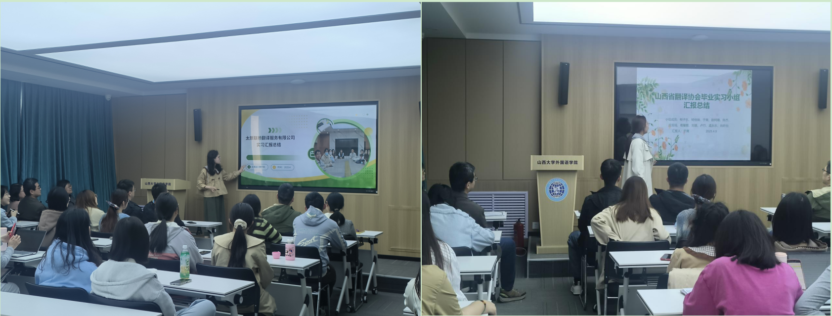 太原联桥翻译公司实习员工代表项宇航同学介绍了公司基本信息和小组成员分工,并表示实习是一次宝贵的学习机会,同学们走出校园,走进社会,亲身感受职场的氛围和工作的要求,加深了对专业知识的理解和应用。山西省翻译协会实习员工代表于爽同学介绍了译协的基本情况以及小组成员的翻译工作,分享了一些实习感悟,并表示大家都希望未来成为对社会有贡献的外语人。新东方实习员工代表侯欣婷和张西子分别介绍了在新东方的工作内容和各自成员的工作感受,表示通过实习工作自己的抗压能力和沟通能力都得到了很大的提升。