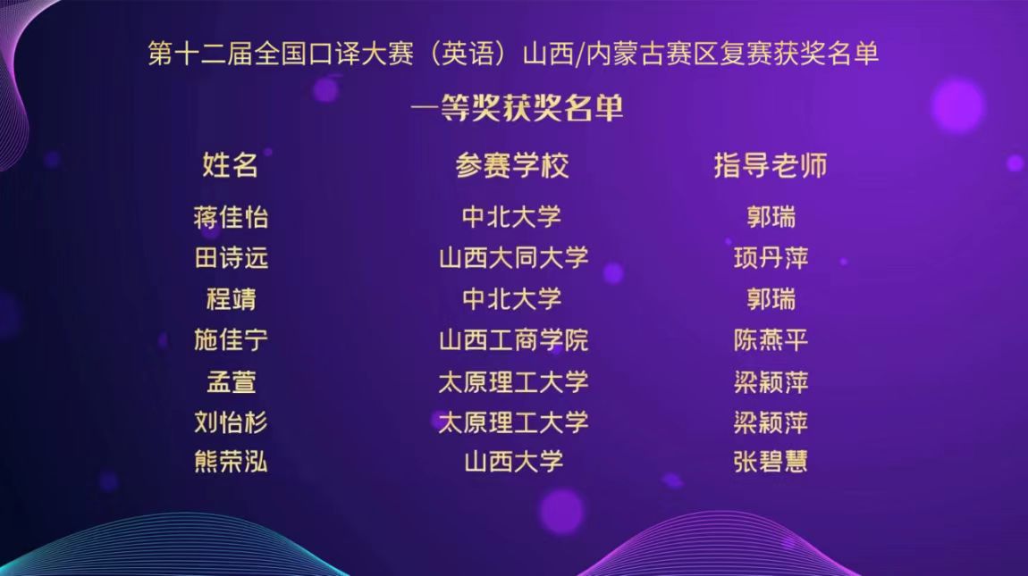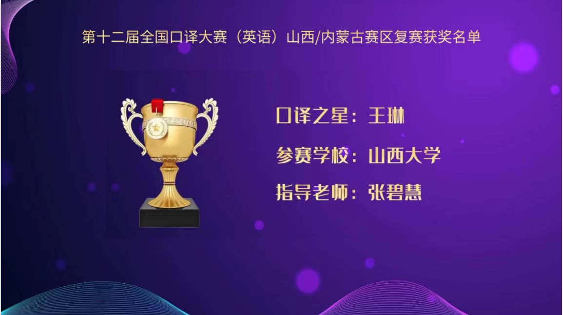 7月14日上午,第十二届全国口译大赛复赛山西赛区总结表彰会顺利召开。公司学子在复赛中表现优异,取得了不俗的成绩。2020级翻译专业王琳同学获得本赛区“口译之星”,2020级翻译专业熊荣泓同学获得一等奖。
