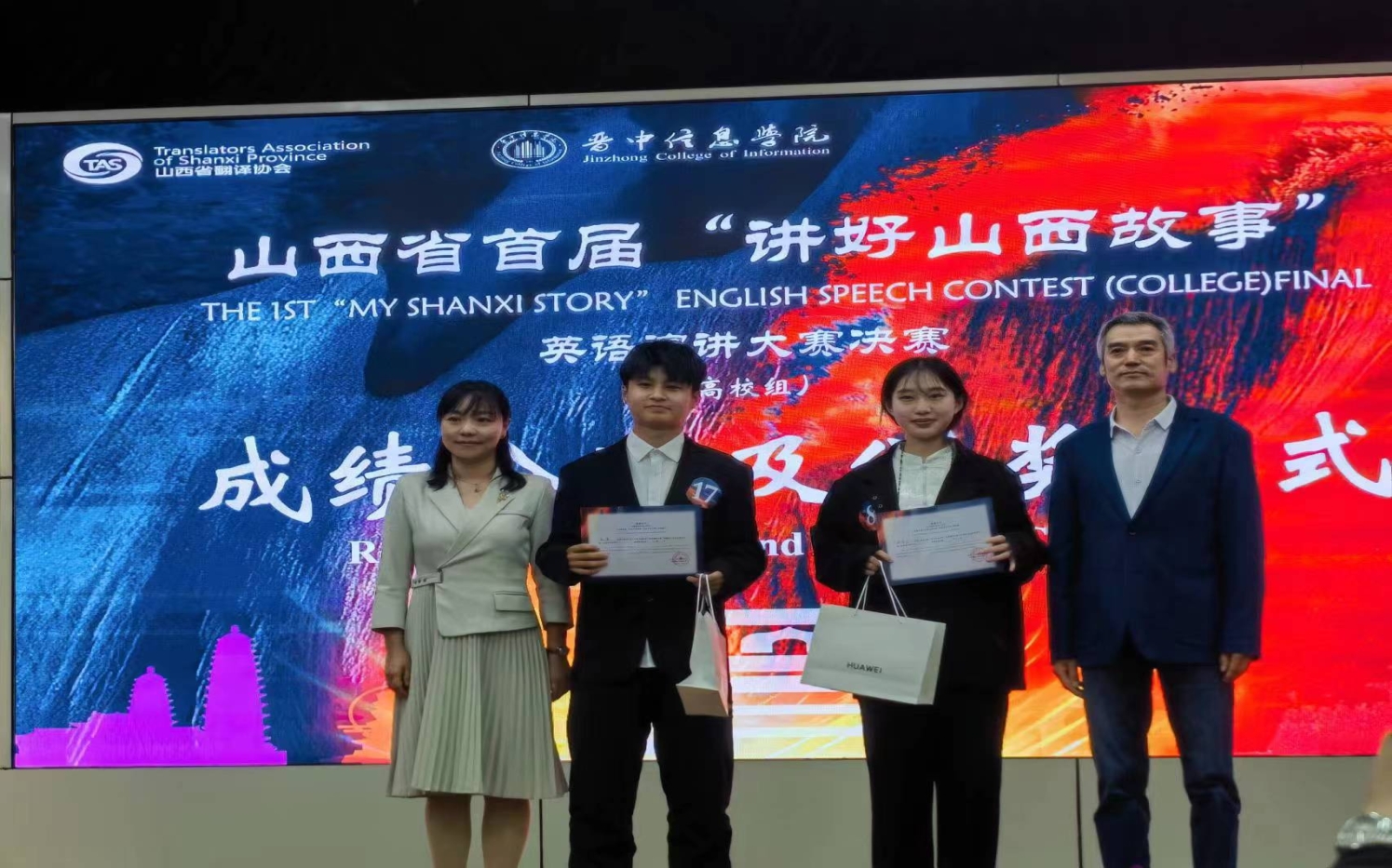 5月7日,由山西省人民政府外事办公室指导、山西省翻译协会和晋中信息公司共同主办的山西省首届“讲好山西故事”英语演讲大赛决赛圆满落幕。公司学子从来自全省5000余名参赛选手中脱颖而出。经过紧张激烈的角逐,由公司英语专业张蓉老师指导的2020级英语专业本科生张琼予荣获一等奖、由英语专业刘芳彤老师指导的2022级英语语言文学专业研究生刘亚萌荣获三等奖。两位老师荣获优秀指导教师奖。