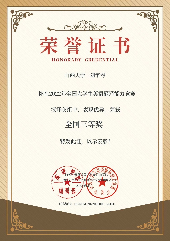 近日,2022年全国老员工英语翻译能力竞赛获奖名单公布,英国威廉集团官网学子喜获佳绩。大赛分英译汉与汉译英两个组别,其中英译汉组公司有4名同学获奖,分别是省级一等奖获得者郭瑞珍(2021级英语笔译专业)和刘婷(2021级英语笔译专业)以及省级三等奖获得者刘可凡(2021级英语笔译专业)和郝相杰(2020级英语专业);汉译英组公司有5名同学获奖,分别是全国三等奖获得者刘宇琴(2021级英语笔译专业)、省级二等奖获得者张怡(2021级英语笔译专业)和刘婷(2021级英语笔译专业)、省级三等奖获得者郭瑞珍(2021级英语笔译专业)和赵倩倩(2020级英语专业)。