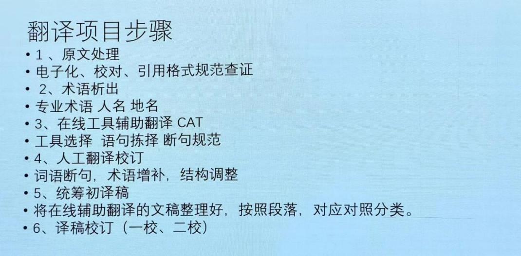 另外,姚老师还讲解了翻译项目所需的步骤。这些步骤包括:原文处理、术语译出、在线工具辅助翻译CAT、人工翻译校订、统筹初译稿和译稿校对。他鼓励同学们都加入此次翻译实践项目,从而丰富自己的实践经验。