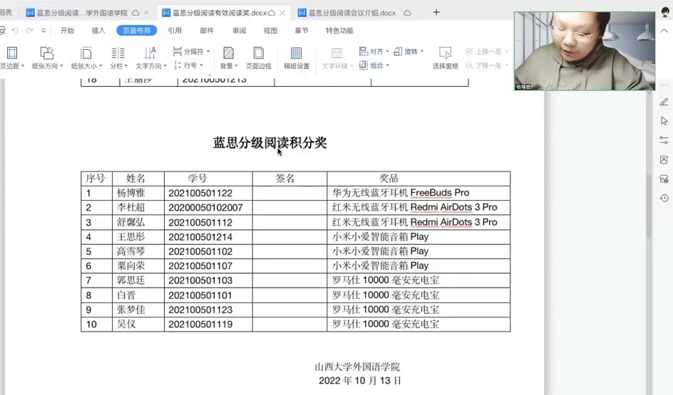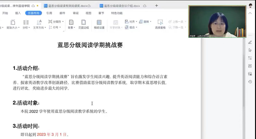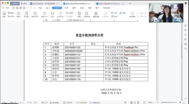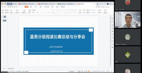 2021年下半年,公司安排2021级员工试用了蓝思分级阅读系统。2022年10月13日晚,公司在线上召开了基于试用阶段使用情况的“蓝思分级阅读颁奖及经验分享会”。教学副经理荆素蓉老师、蓝思分级阅读系统负责人李亚伟老师、2022级英语专业和翻译专业的三位精读课老师、2022级新生及2021级各位获奖同学参加了本次会议,会议由外院蓝思分级阅读活动负责人尹桂萍老师主持。