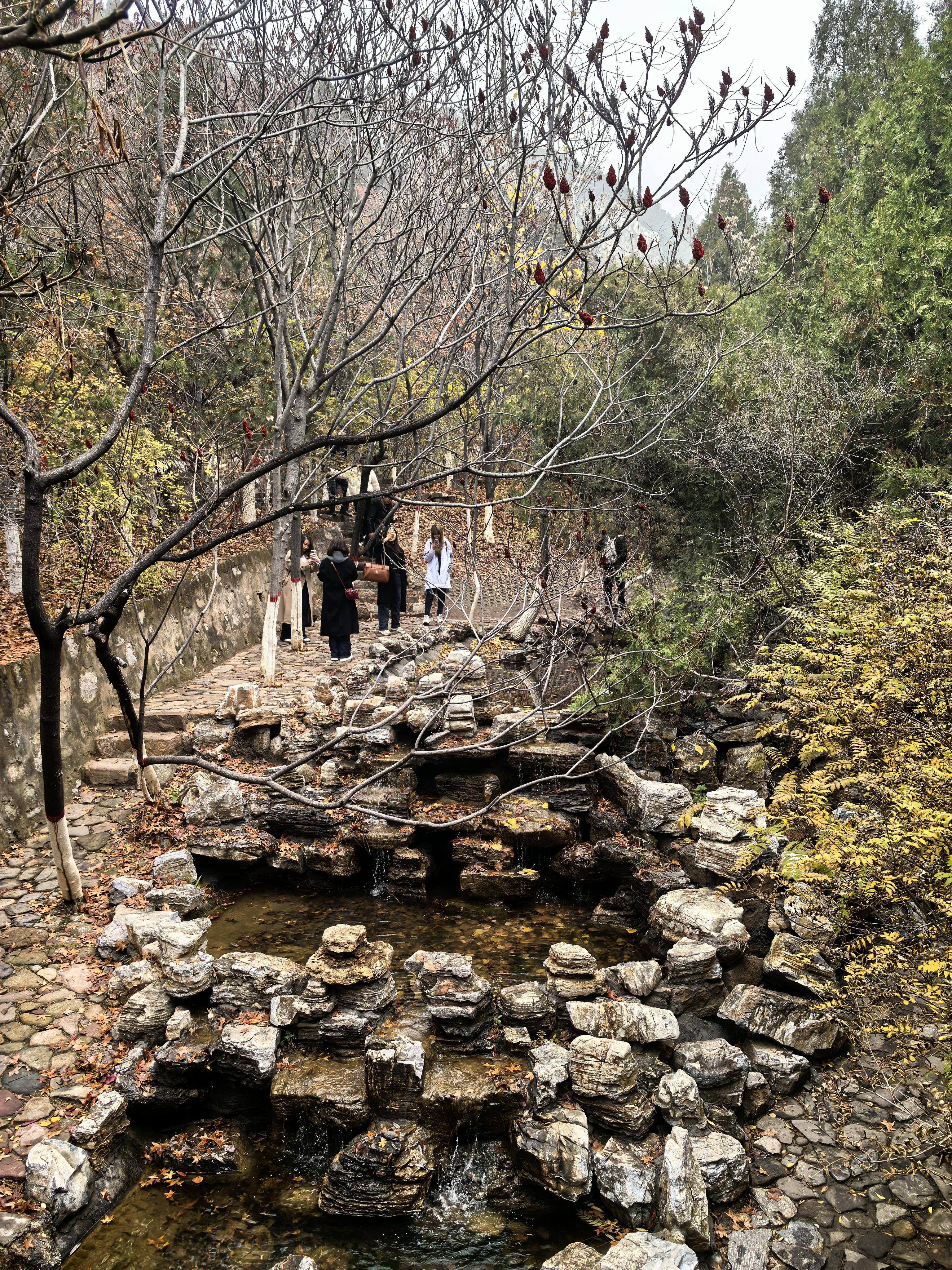 位于晋源古城风峪沟群山之中的太山,以形似“太”字而得名。作为晋阳古城宗教祭祀区的重要组成部分,太山有着深厚的历史文化底蕴。“戛戛秋蝉响似筝, 听蝉闲停柳边行。小溪清水平如镜, 一叶飞来细浪生”。踏入太山,仿佛进入了一个世外桃源。远处的山峦在秋色中连绵起伏,轮廓在雾气中若隐若现,仿佛一幅水墨画卷,晕染出无尽的诗意。古色古香的建筑点缀其中,与周围的自然景观相得益彰。微风拂过,枫叶沙沙作响,宛如一首轻快的秋日交响曲。山间的溪流潺潺,为这首秋游交响曲锦上添花。