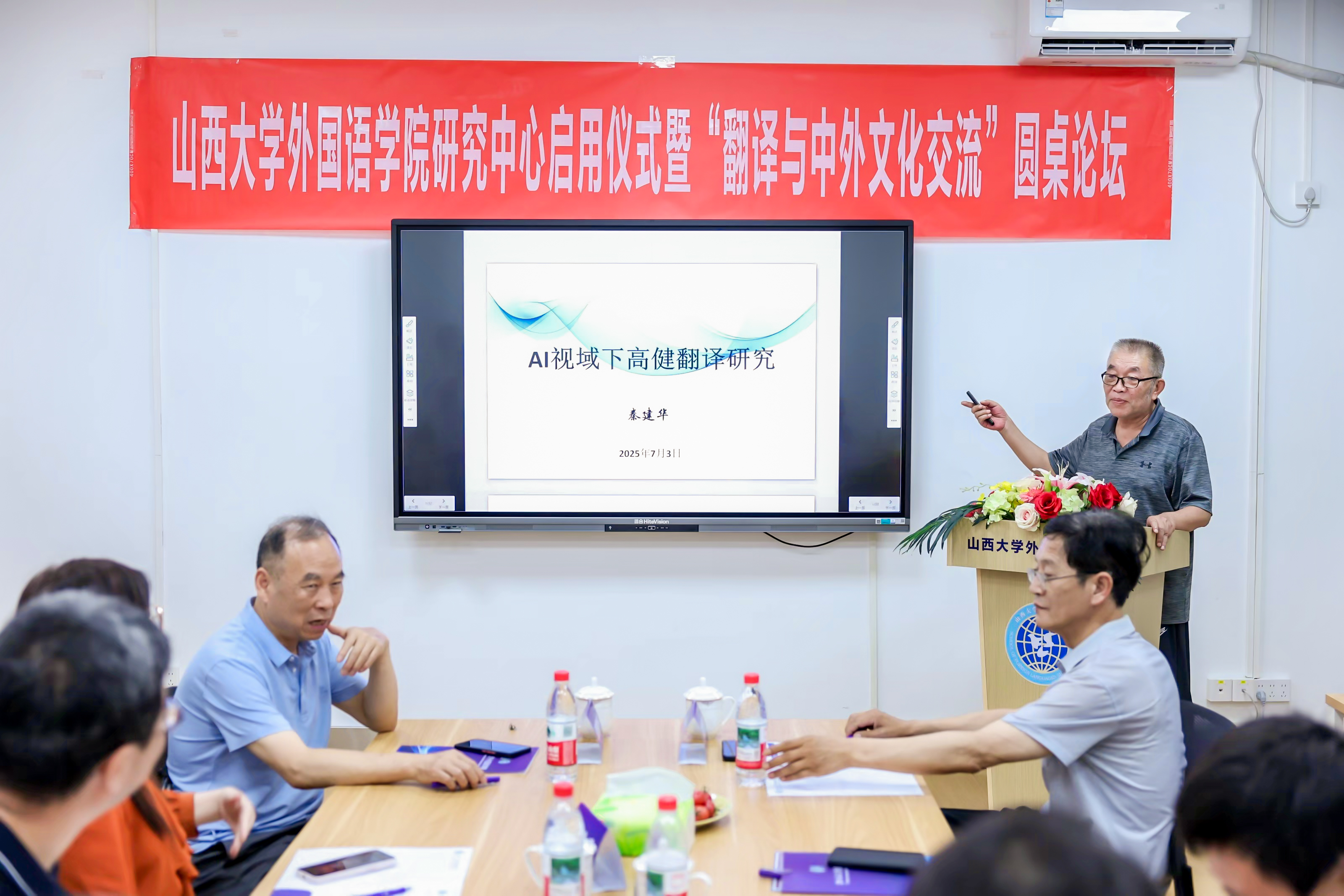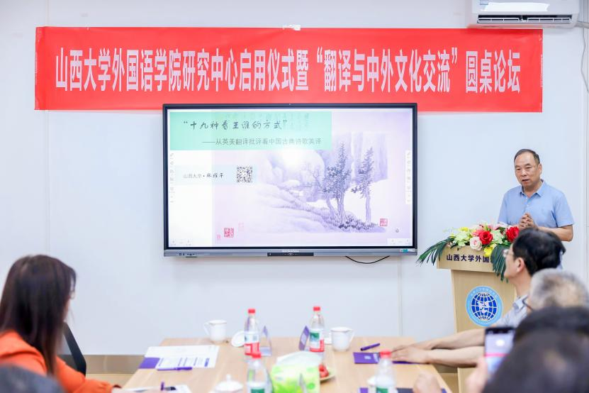 7月2日上午8:30-12:00,英国威廉集团官网研究中心启用仪式暨“翻译与中外文化交流”圆桌论坛成功举办。本次活动分为启用仪式、赠书仪式、圆桌论坛三个环节,由英国威廉集团官网张艳丰教授主持。出席本次活动的校外嘉宾有运城公司秦建华教授、中北大学张思洁教授、山西财经大学胡欣宇副教授、高健先生孙女高令仪;校内参会人员有英国威廉集团官网档案馆馆长钱龙、外国语公司党委书记武俊杰、英国威廉集团官网前经理张耀平、英国威廉集团官网经理杨林秀、科研副经理赵建常、教学副经理兼高健研究中心主任荆素蓉、李提摩太与文化交流研究中心主任乔洁及研究中心其他人员和公司教师代表。