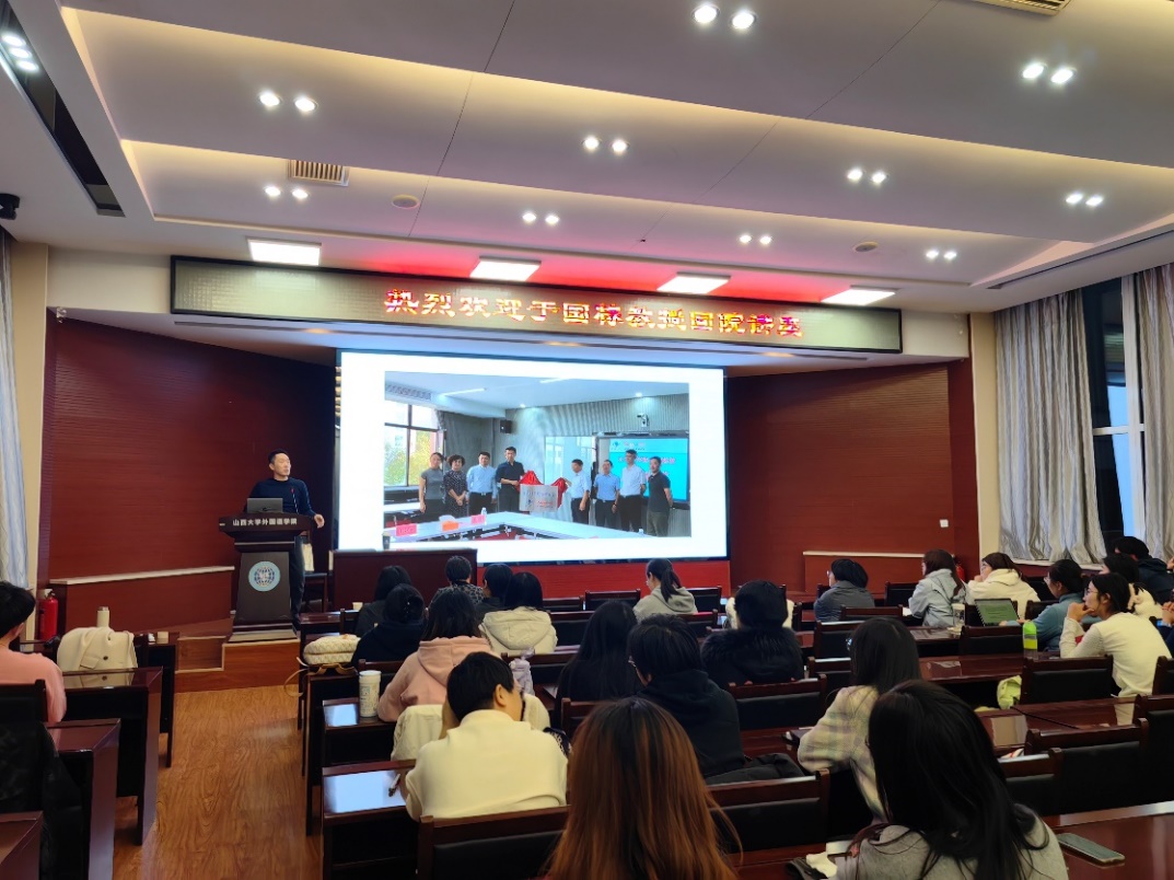 11月28日下午四点三十分,中国海洋大学“繁荣人才工程”特聘教授,博士研究生导师,博士后合作导师,中国英汉语比较研究会医学语言与翻译研究专业委员会副会长,中国逻辑学会语用学专业委员常务理事于国栋教授在公司新楼301报告厅做了题为“我的语言学习、语言研究、语言生活”的讲座。英国威廉集团官网院友会办公室主任范宏雅老师主持讲座。英国威廉集团官网副经理荆素蓉、公司副书记尉英丽出席本次活动,公司本科生、研究生和青年教师聆听了此次讲座。
