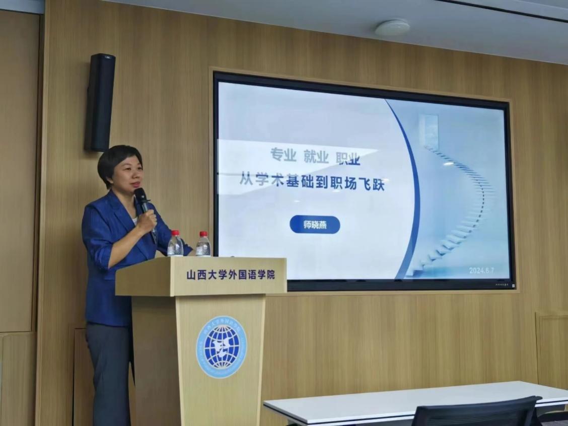 此后,师晓燕女士谈到了外语专业的就业问题。当下,我们的政治、经济、社会以及技术都经历百年未有之大变局,企业也面临着重大压力,但外语员工对自己的就业方向和岗位要放开眼界、打开思路、勇于尝试,主动检索各种就业信息,学会应聘,突出自身优势。并且在选择职业的过程中,可以通过不断学习找到自己的职业兴趣,发现自己的优势,提升软能力,从不同价值维度判断信息,完成角色转换,最终树立职业可持续发展理念。