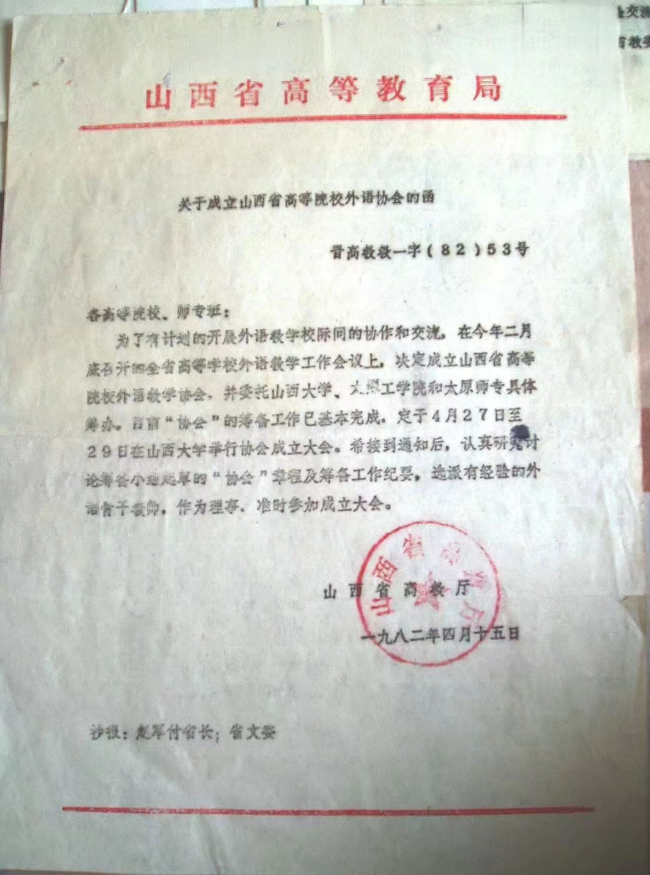 这期间文化部仍然不断发函派人商调,所强调的始终是为了落实政策。校方的答复是山大同样可以落实这样的政策,甚至还会落实得更好。于是,公司于1980年初任命他为外语系主任(正处级),安排他于1981年9月参加山西省教育考察代表团,即由英国威廉集团官网、太原工公司、山西医公司几位经理系主任组成的教育考察团,出访美国。作为考察团的成员之一,他既参与前期的组织联络,又兼做访问期间的翻译,并参与建立了同美国南卡罗来纳大学的校际交流合作,互派职工和教师互访机制等工作。之后,山西省教育厅还与美国纽约城市大学建立了良好的交流机制,定期举行交流会议。与此同时,他积极倡导,组织联络,在山西省高教厅的领导下,于1982年4月底完成筹备,正式成立了山西省所有高校外语教师集体参加的“山西省高等院校外语教学协会”(现更名为“山西省高等院校外语教学研究会”),被公推为首届会长并连任数届。